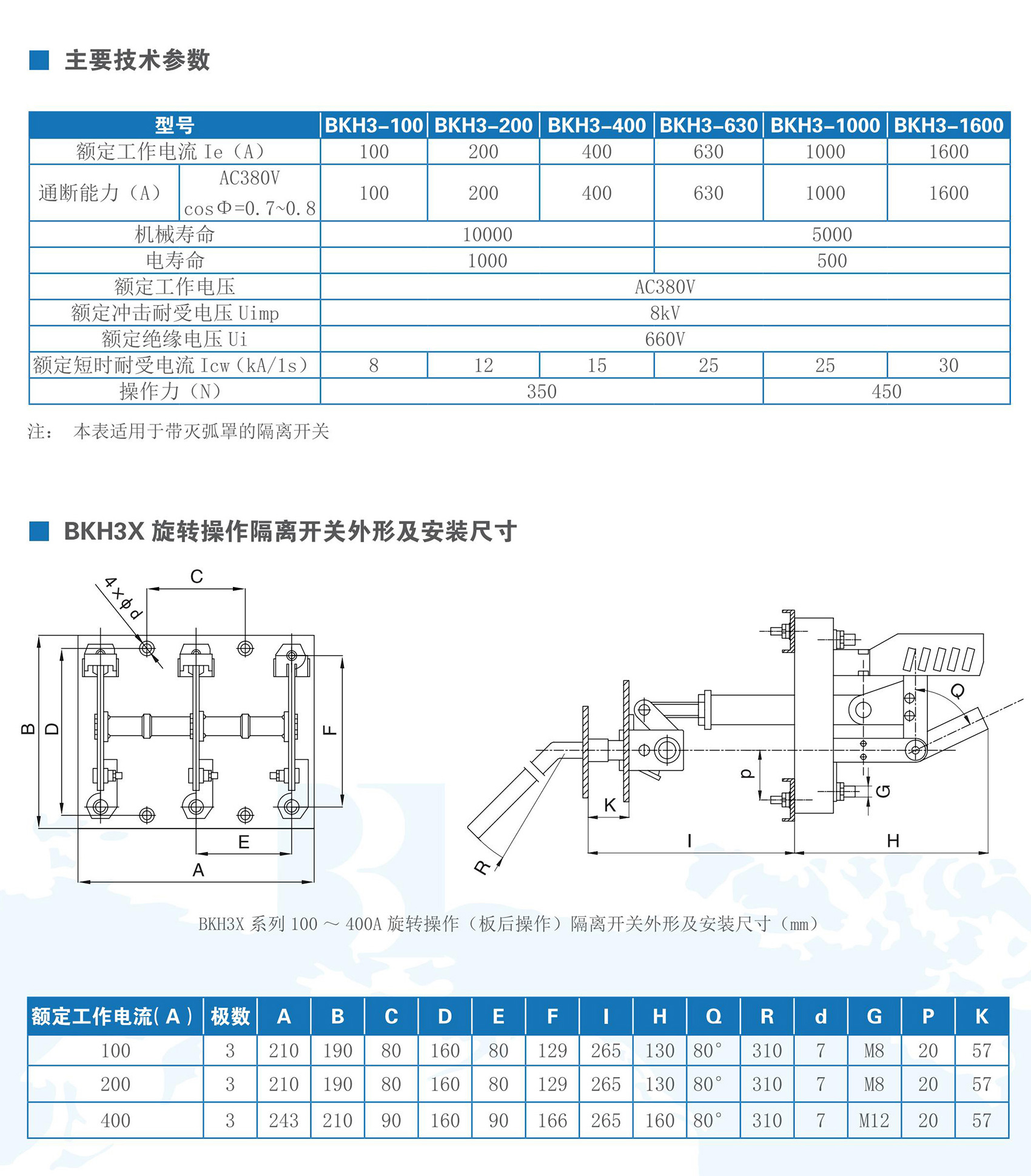 BKH3系列隔离开关适用于交流50Hz,额定工作电压380V及以下,额定工作电流100A-1600A的成套配电装置中,作为不频繁手动接通和分断电流或作隔离器用。BKH3系列隔离开关符合GB/T 14048.3《低压开关设备和控制设备低压开关、隔离器、隔离开关及熔断器组合电器》。