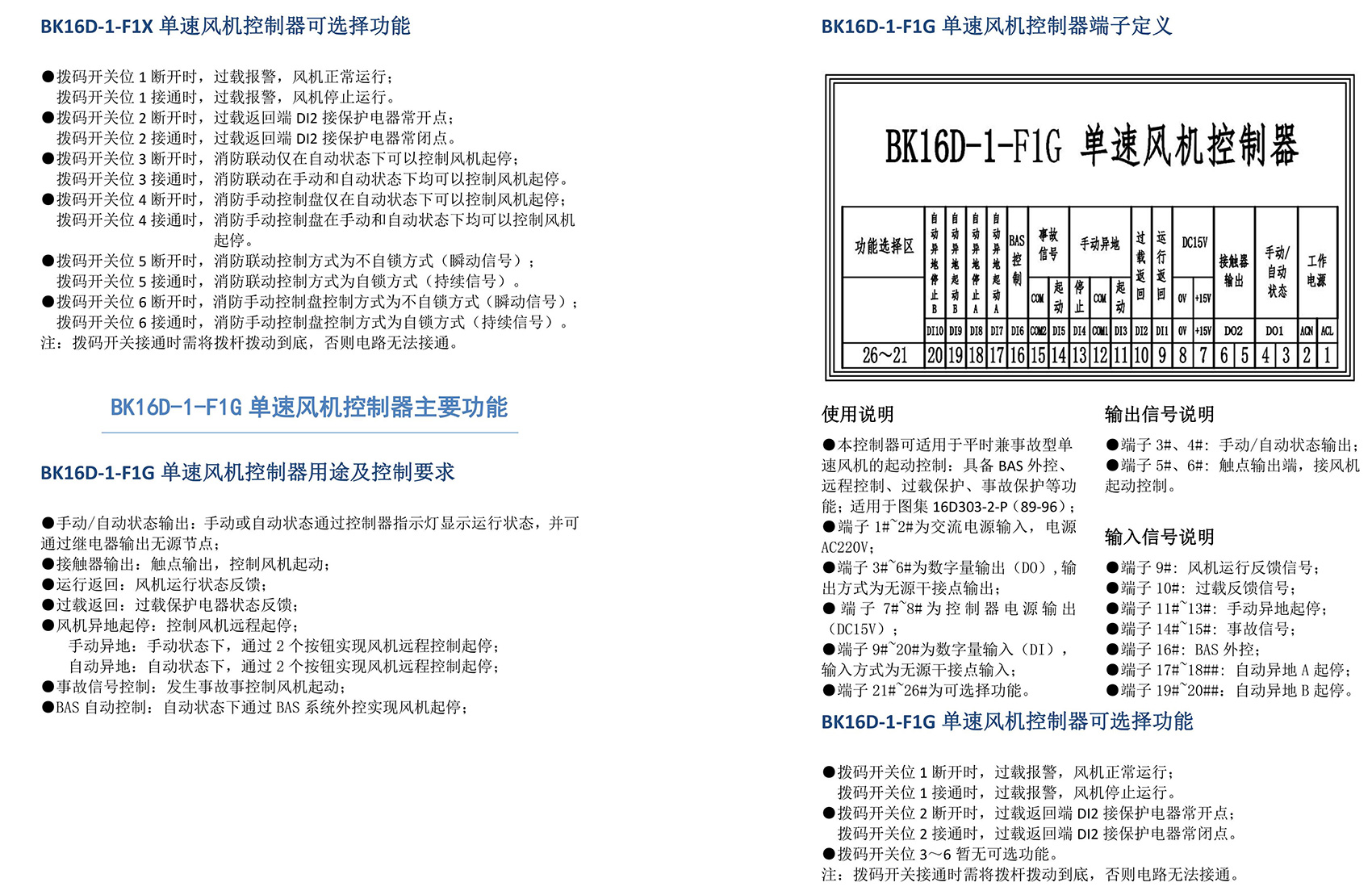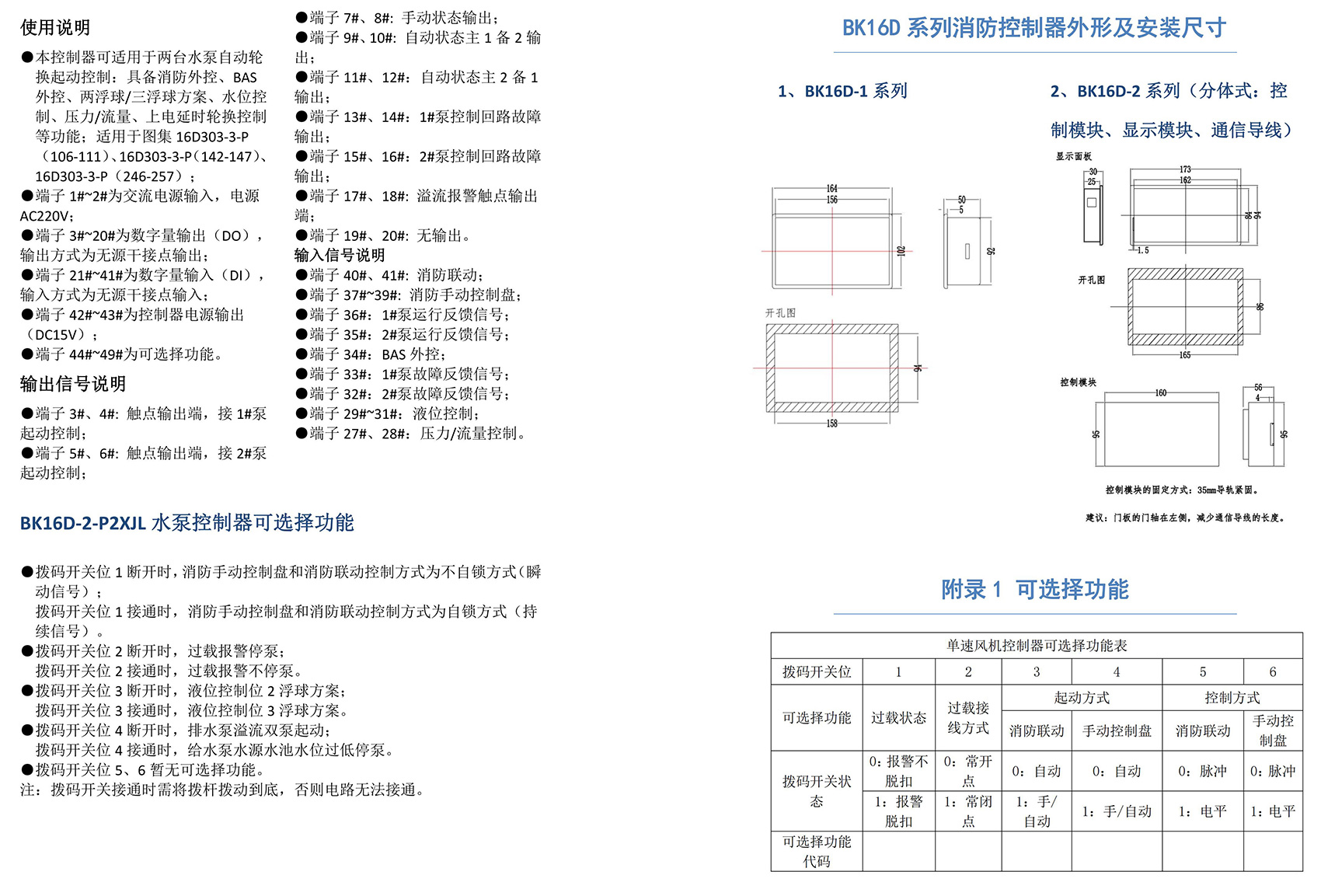 BK16D系列电动设备控制器是一款针对行业风机水泵控制箱设计的系列产品,产品满足国家建筑标准设计图集《16D303-2 常用风机控制电路图》及《16D303-3 常用水泵控制电路图》。本产品采用智能化手段,用逻辑计算代替了传统的按钮、指示灯、转换开关、中间继电器、时间继电器等器件,接线方便,简单快捷。相较于传统的接线方式,本产品可节约硬件投入、减少二次布线、节约工时,并具备故障率低,检修方便。